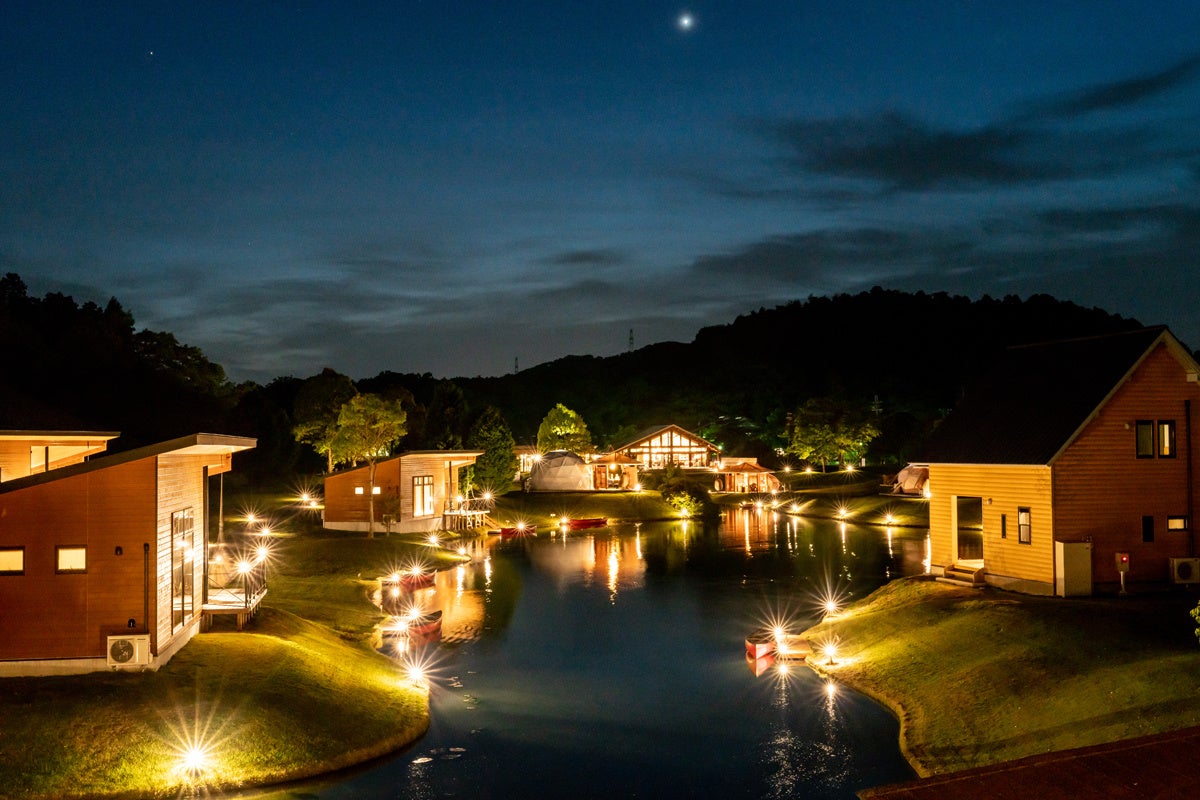 滋賀県米原市にある県内最大級の大型グランピング施設。滋賀県最高峰の伊吹山が見える眺望や大きな池でカヌーを楽しめるロケーションの中で本格的なグランピング料理が味わえます。リゾート感あふれるドリンクを提供するバーテラスやラウンジを中心に、池の周りに配した客室棟は全18棟。夜の美しい夜景も人気があります。