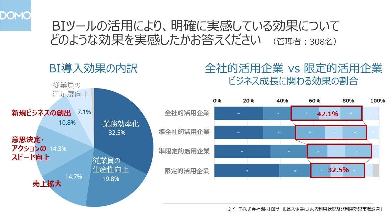 ドーモ、BIツール導入企業における利用状況及び利用効果市場調査を公開 BIツール全社活用率が高い(75%以上)企業ほど、 「売上拡大」「新規ビジネスの創出」などのビジネス成長への効果実感が高い