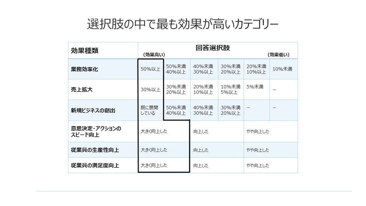 ・従業員の生産性向上:業務の平準化、業務内容の最適化、業務内容の改革など(業務における成果の向上)