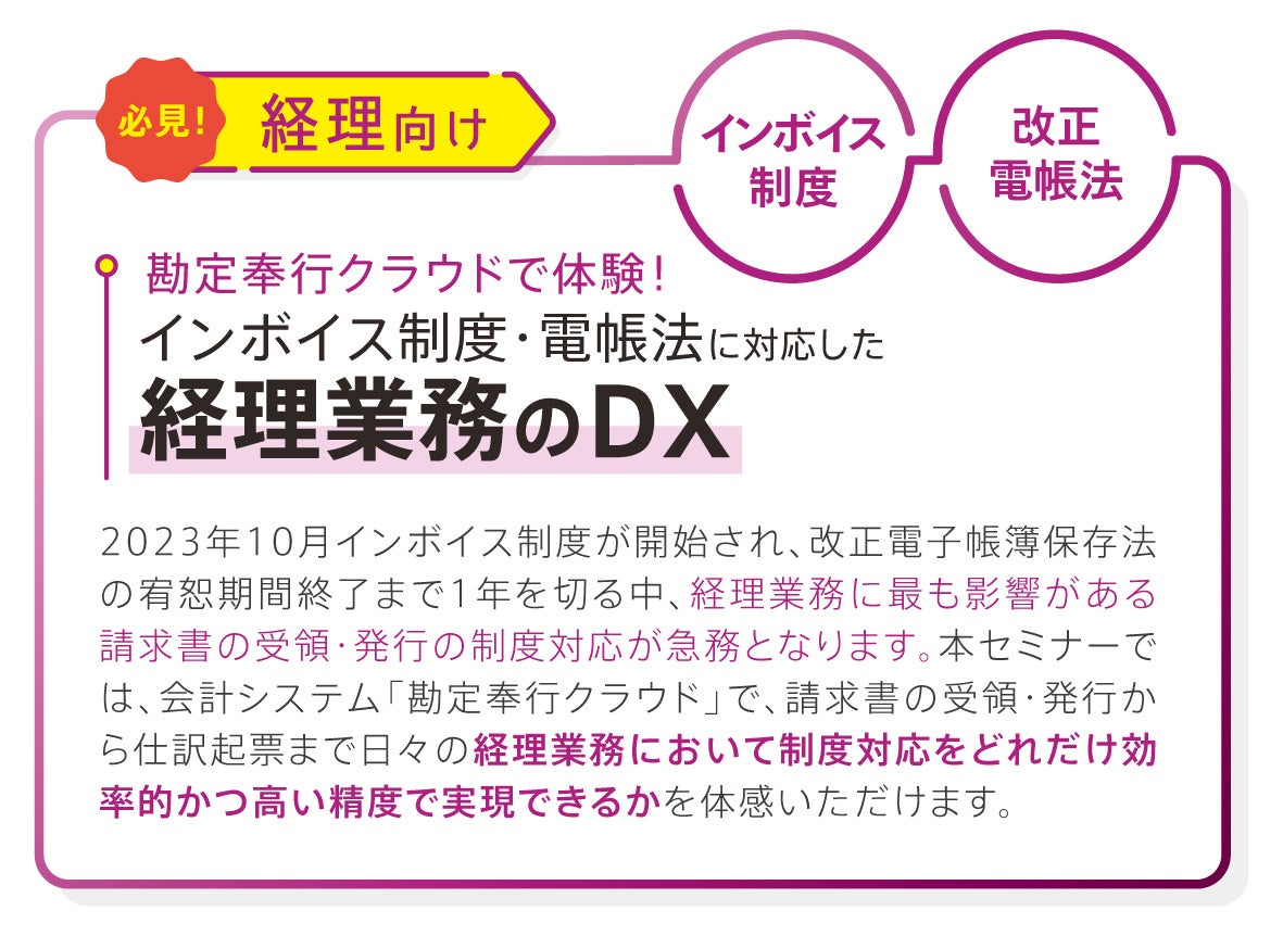 そこでOBCでは、″実際に見て・触って・体験“できる『奉行クラウド体験フェア2023』を開催し、インボイス制度、電帳法に対応した業務をじっくり体験し、理解できる場を設けます。おひとり様パソコン1台の環境で、新たに適格請求書(インボイス)発行に対応し、請求書の受領・発行の両方に対応した『勘定奉行クラウド(5月26日発売)』を実際に触って、実務を体験可能です。