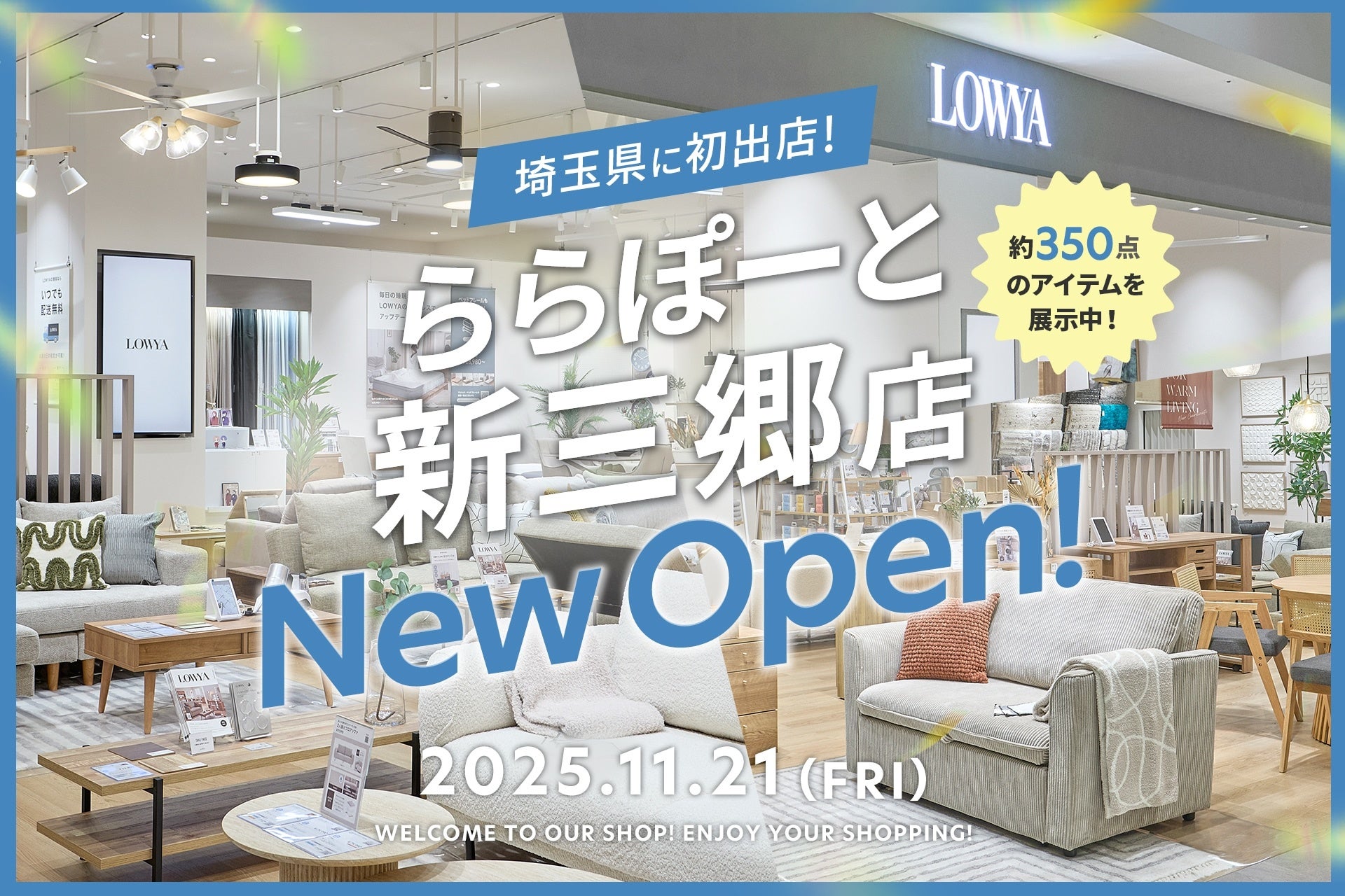 この度、株式会社ベガコーポレーション(本社:福岡県福岡市博多区、代表取締役社長:浮城 智和、証券コード:3542、URL:https://www.vega-c.com/)が運営する、家具・インテリアブランド「LOWYA」(呼称:ロウヤ、URL:https://www.low-ya.com/)は、2025年11月21日(金)に「LOWYAららぽーと新三郷店」をオープンいたします。埼玉県に初出店で、LOWYAの実店舗としては通算11店舗目の開業となります。