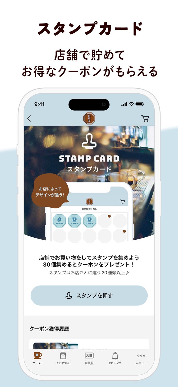 公式アプリ導入前に実施していたスタンプカードサービス(※サービス内容は異なります)を今回のリニューアルに伴い再開し、スタンプが貯まるごとにお得なクーポンを配布いたします。「紙のスタンプカードを捨てるのがもったいない!」というお声もありましたが、アプリ版スタンプカードでは何枚でも保管ができ、来店記録としても楽しんでいただけるようになりました。