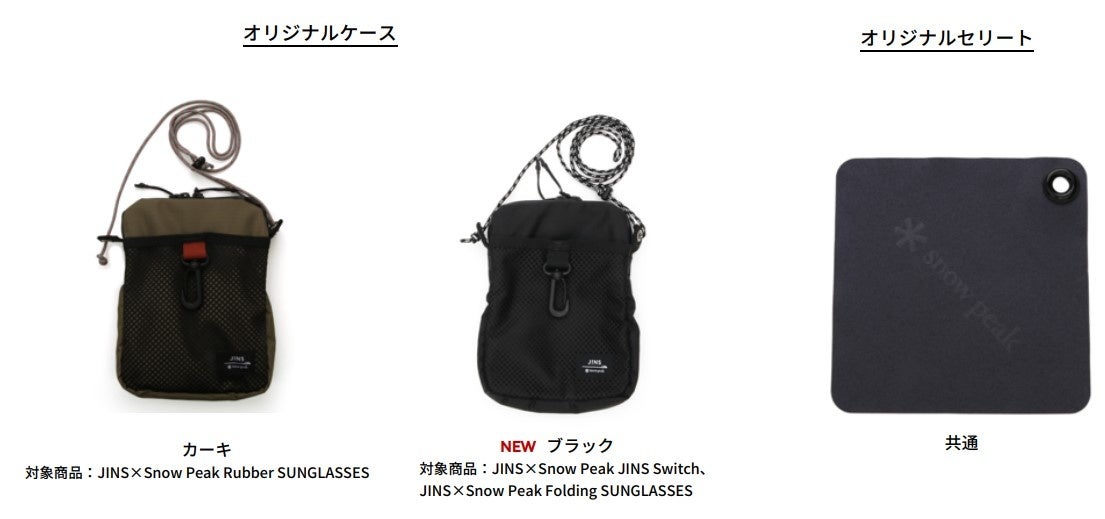 また、全ての商品にオリジナルケースとセリートが付属。オリジナルケースはSnow Peak製品のテント生地やテントロープなどの素材を使用したサコッシュタイプ。Rubber SUNGLASSESには、昨年好評を博したカーキのカラー、JINS SwitchとFolding SUNGLASSESには新色となるブラックのカラーのケースが付属します。サングラスと共に豊かなアウトドアライフをお楽しみください。