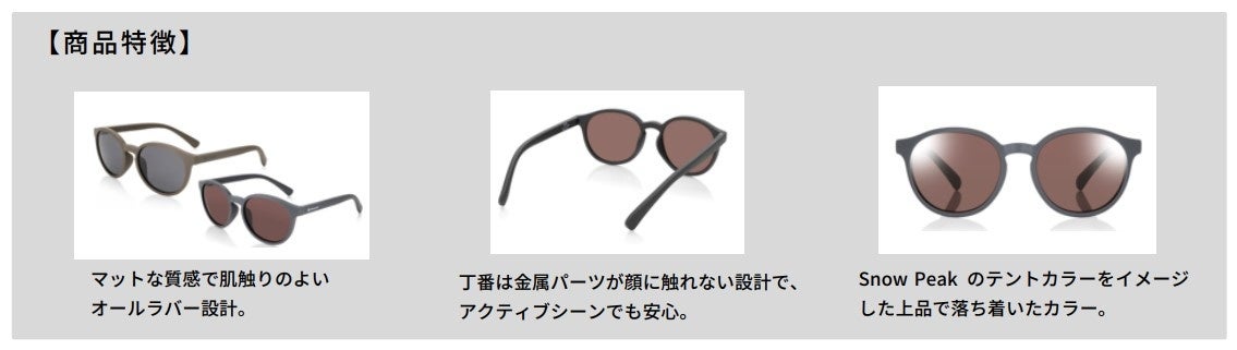 1つ目は、屋内外を行き来する時でもプレートを着脱するだけでメガネとサングラスを簡単にスイッチできる「JINS×Snow Peak JINS Switch」にネイビーが新色で登場。テンプルエンドが可動式で簡単にかかり具合を調整できるので、下を向くことが多いシーンでも安心です。2つ目は、使わないときはコンパクトに折りたたんでバックパックなどの隙間に収納できる優れた携帯性が特徴の「JINS×Snow Peak Folding SUNGLASSES」。クリアと透け感のあるピンクが新色として加わります。3つ目は、オールラバー設計でフレームに弾力があり、アクティブなシーンでも安心してお使いいただける「JINS×Snow Peak Rubber SUNGLASSES」。マットな質感に映えるチャコールグレーとウッドブラウンを新たに追加。各サングラスのテンプル内側には本コラボレーションのオリジナルロゴ、外側にはSnow Peakのロゴを配しました。