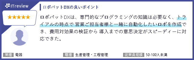 株式会社FCEプロセス&テクノロジー(東京都新宿区、代表取締役社長:永田純一郎)が提供する純国産RPA『RPA Robo-Pat DX(以下、RPAロボパットDX)』は、アイティクラウド株式会社(以下:アイティクラウド 本社:東京都港区、代表取締役社長:黒野 源太)が提供するSaaSプロダクト比較・分析レポート「ITreviewカテゴリーレポート」のRPA部門において最も高い満足度を獲得し、「顧客満足度No.1」を獲得いたしました。
