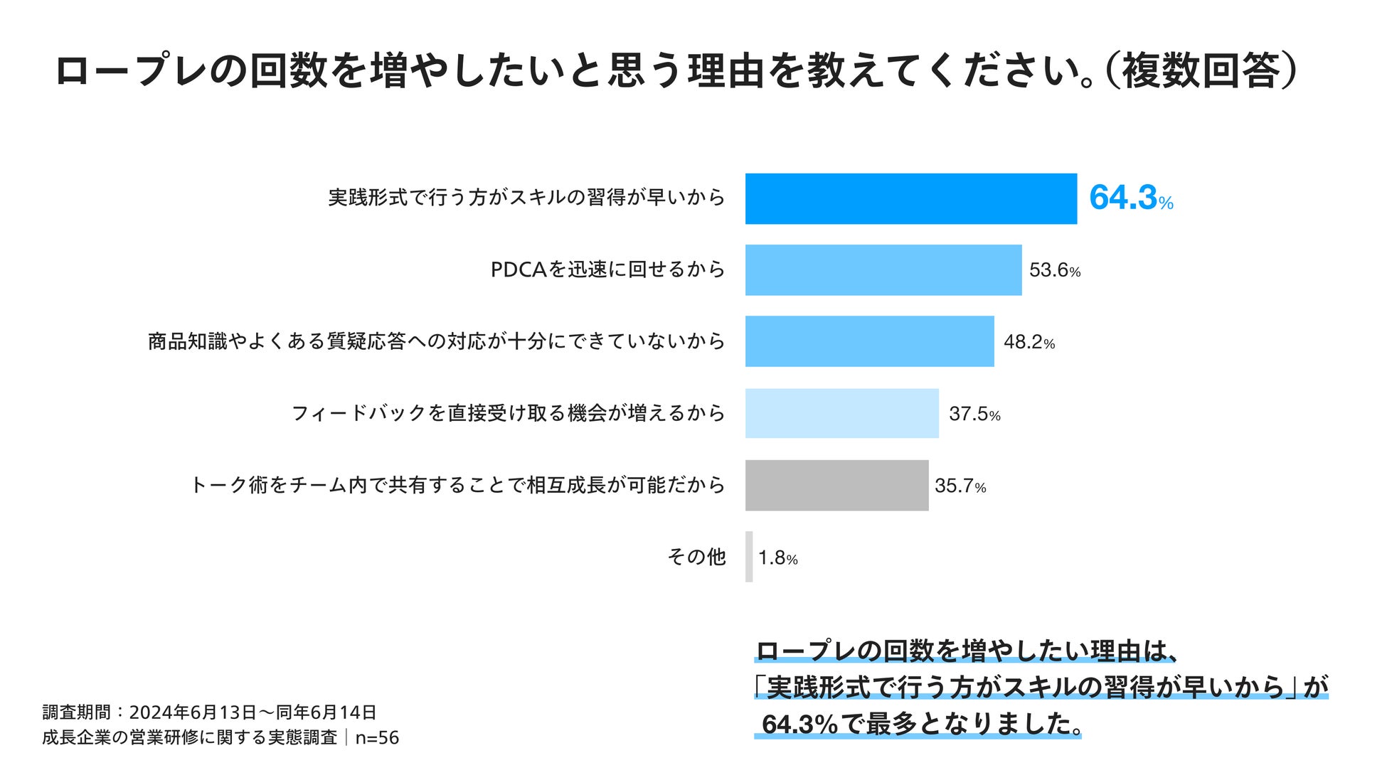 また、「今後、ロープレの頻度をさらに上げていきたいと思いますか。」に「非常にそう思う」「ややそう思う」と回答した方に、「ロープレの回数を増やしたいと思う理由を教えてください(複数回答)」(n=56)と質問したところ、「実践形式で行う方がスキルの習得が早いから」が64.3%、「PDCAを迅速に回せるから」が53.6%、「商品知識やよくある質疑応答への対応が十分にできていないから」が48.2%という回答となりました。
