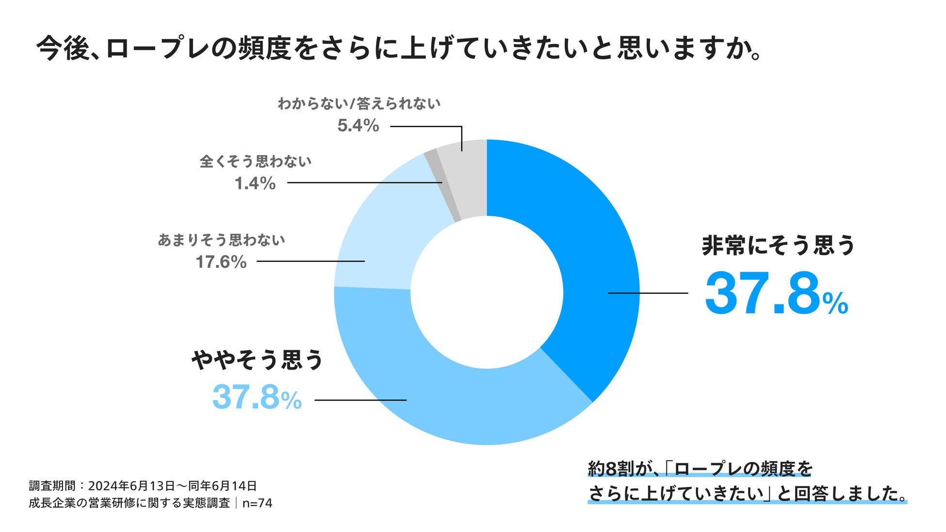 「ロープレを実施している」と回答した方に、「今後、ロープレの頻度をさらに上げていきたいと思いますか。」(n=74)と質問したところ、「非常にそう思う」が37.8%、「ややそう思う」が37.8%が回答し、7割以上がロープレの頻度を上げたい意向を持っていました。