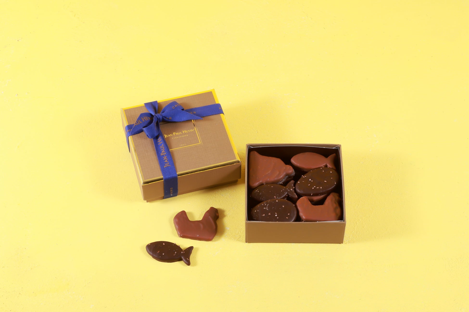 カリカリとした食感のヌガティーヌを加えたアーモンドとヘーゼルナッツのプラリネを、イワシをかたどったビターチョコレートでコーティング。【価格】 648円(税込)