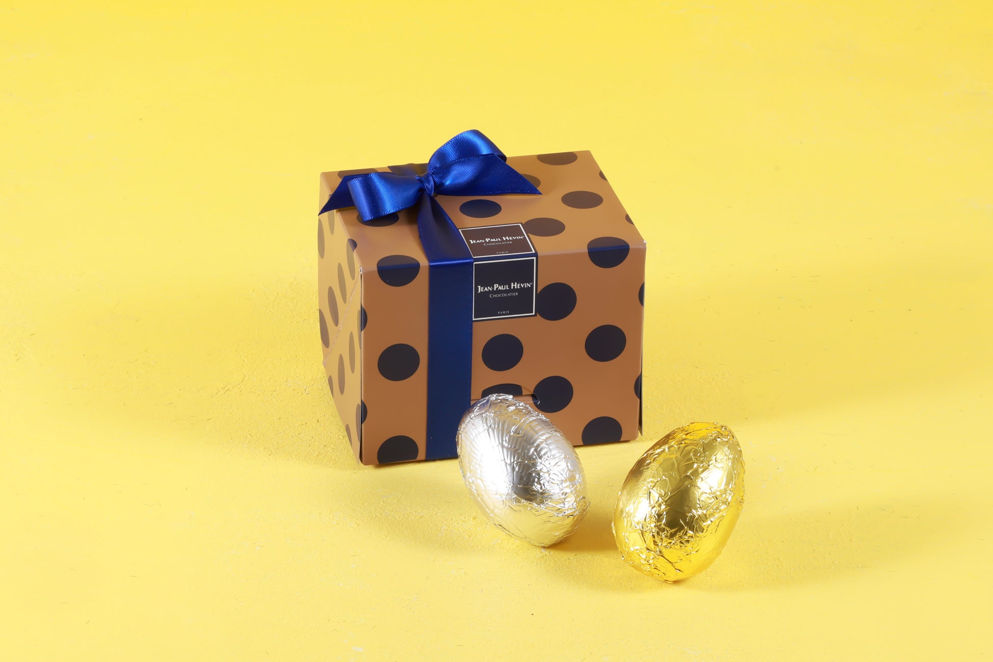 ひとつずつ職人の手で作り上げたイースターの卵、「ウフ レ ドレ」(ゴールド/ミルクチョコレート)と「ウフ ノワール アルジャンテ カメルーン」(シルバー/ビターチョコレート)を各1個詰合せ。