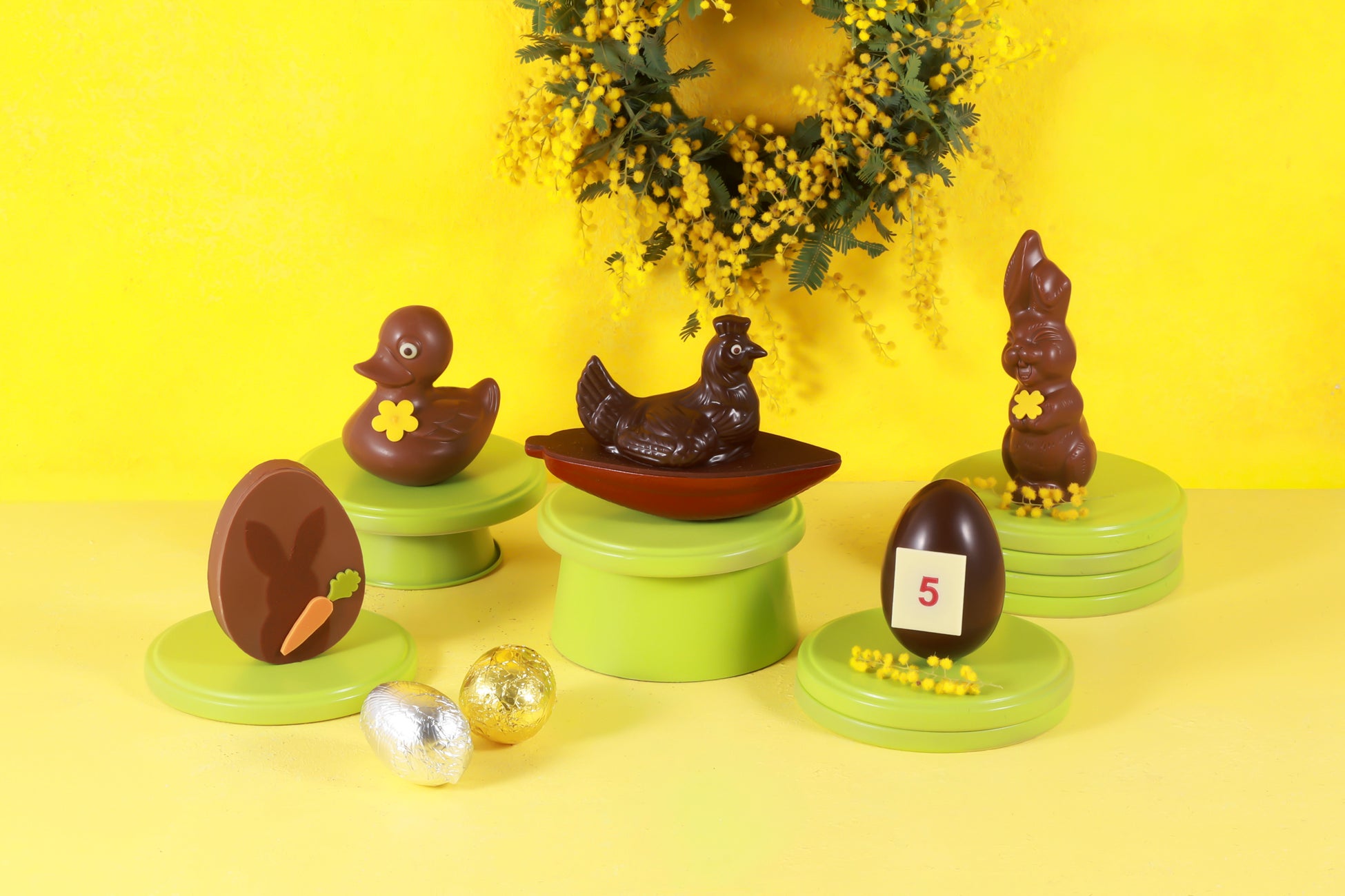 イースターのモチーフ(卵や鐘、動物)をかたどったサブレを、ビターとミルクのチョコレートでコーティング。