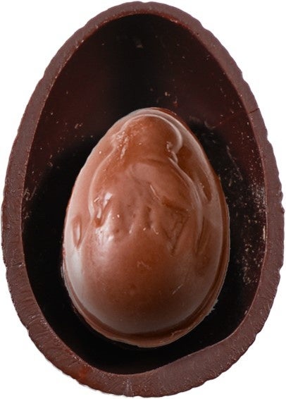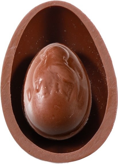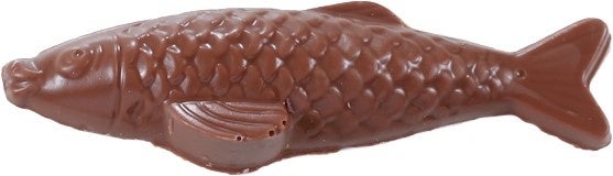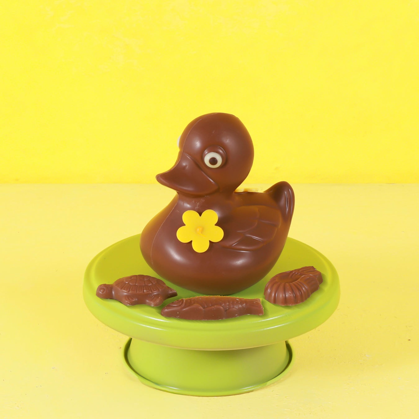 チョコレートでつくられたアヒル。中には、イースターのモチーフである魚や海の生き物をかたどった「フリチュール」が3個入っています。