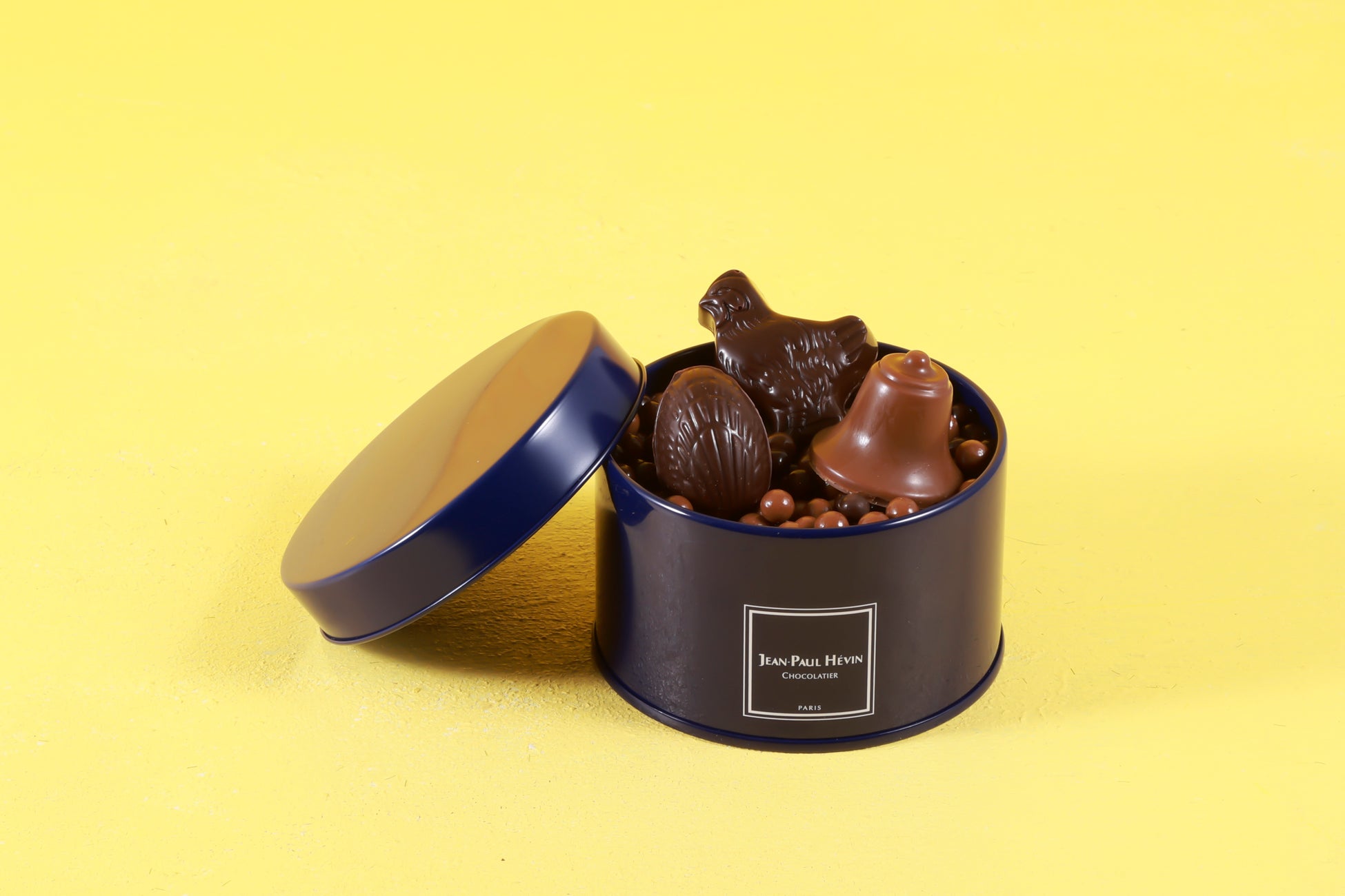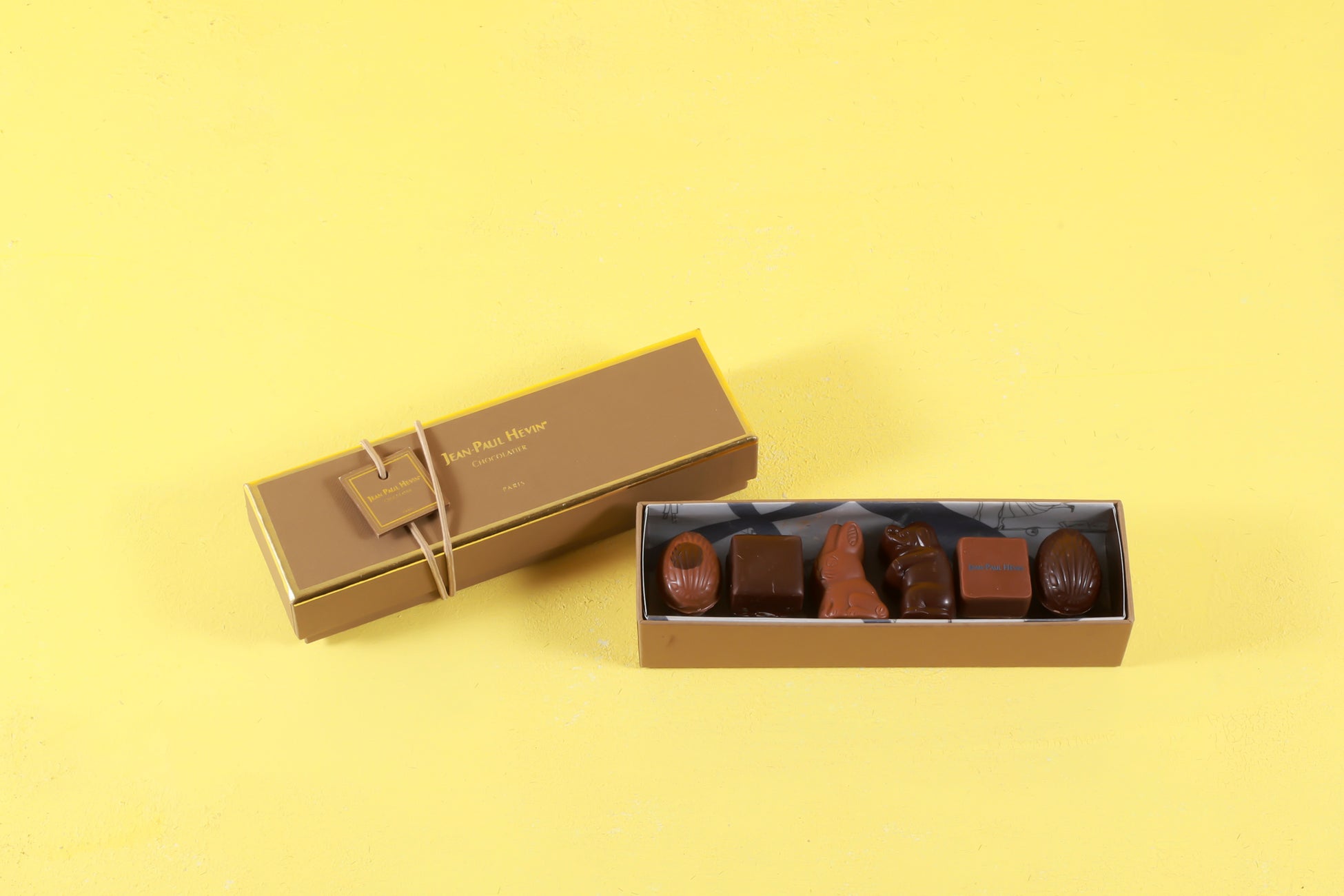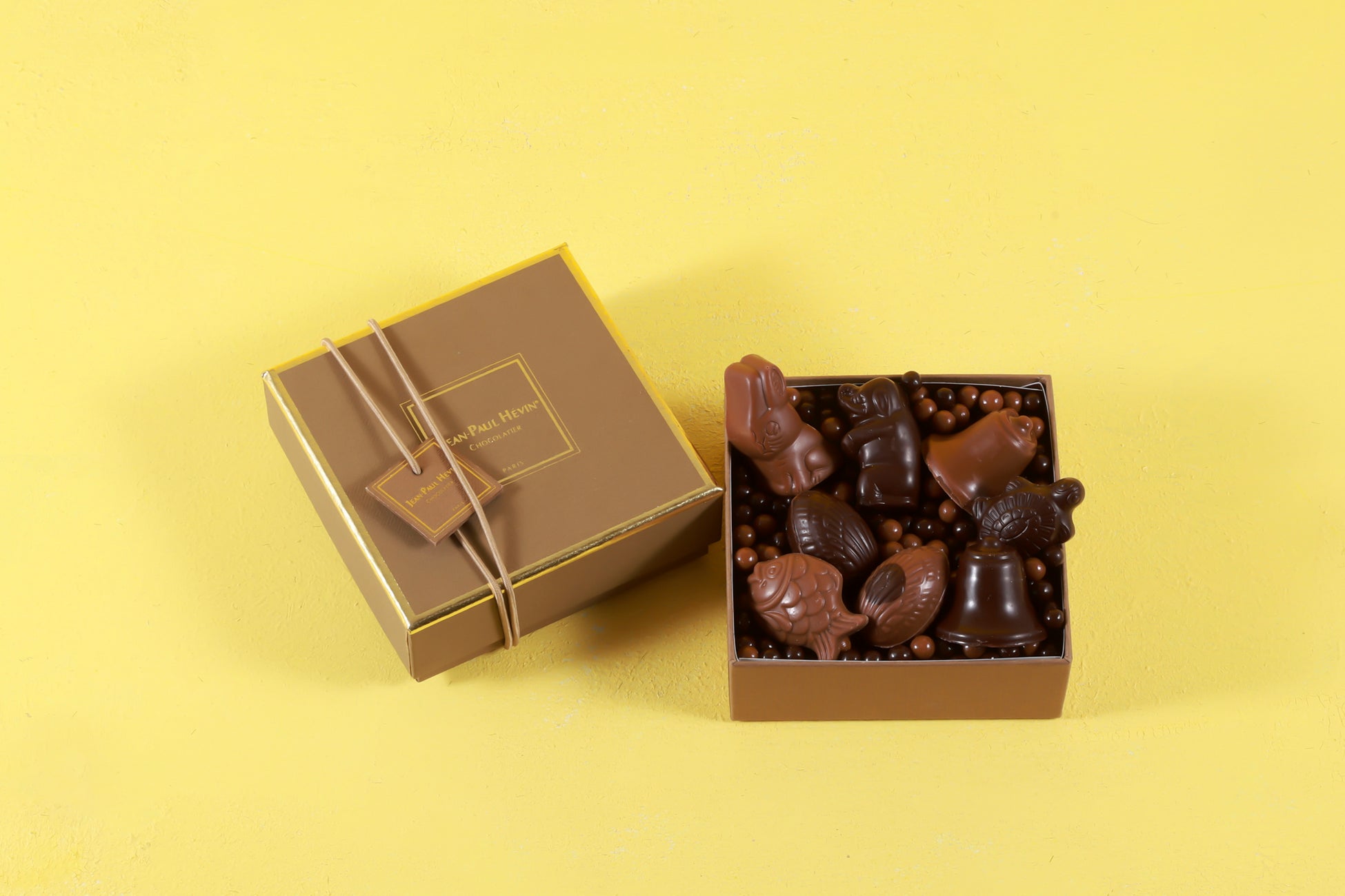 卵形の「ウフ」、動物をかたどった「アニモ」、鐘をモチーフにした「クロッシュ」、海の生き物をかたどった「フリチュール」、「ペルル クラッカントゥ ショコラ メランジュ」の詰合せ。