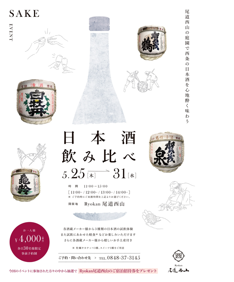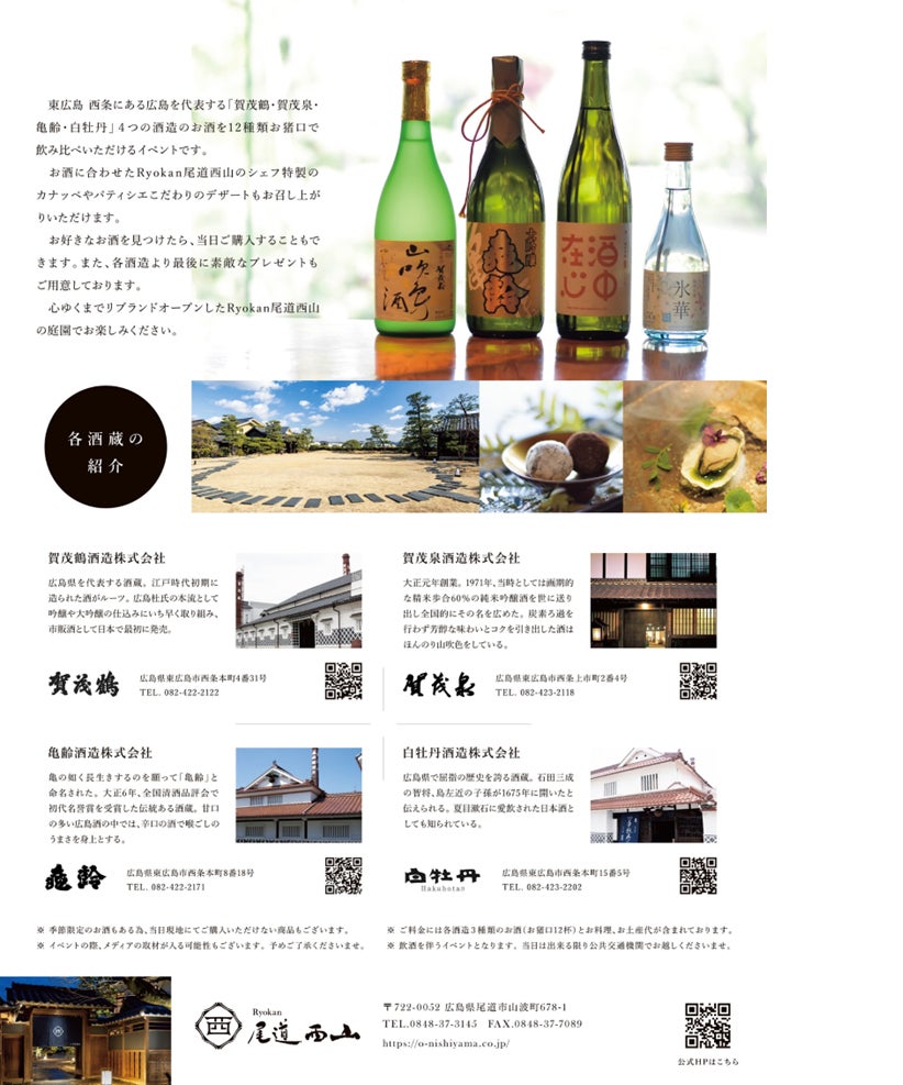 当日は、日本酒の販売や各酒造からのプレゼント、お酒に合わせた「Ryokan尾道西山」のシェフ特製のカナッペやパティシエこだわりのデザートなどご用意し、皆さまのお越しをお待ちしております。定員は、事前予約制で各日30名様まで。