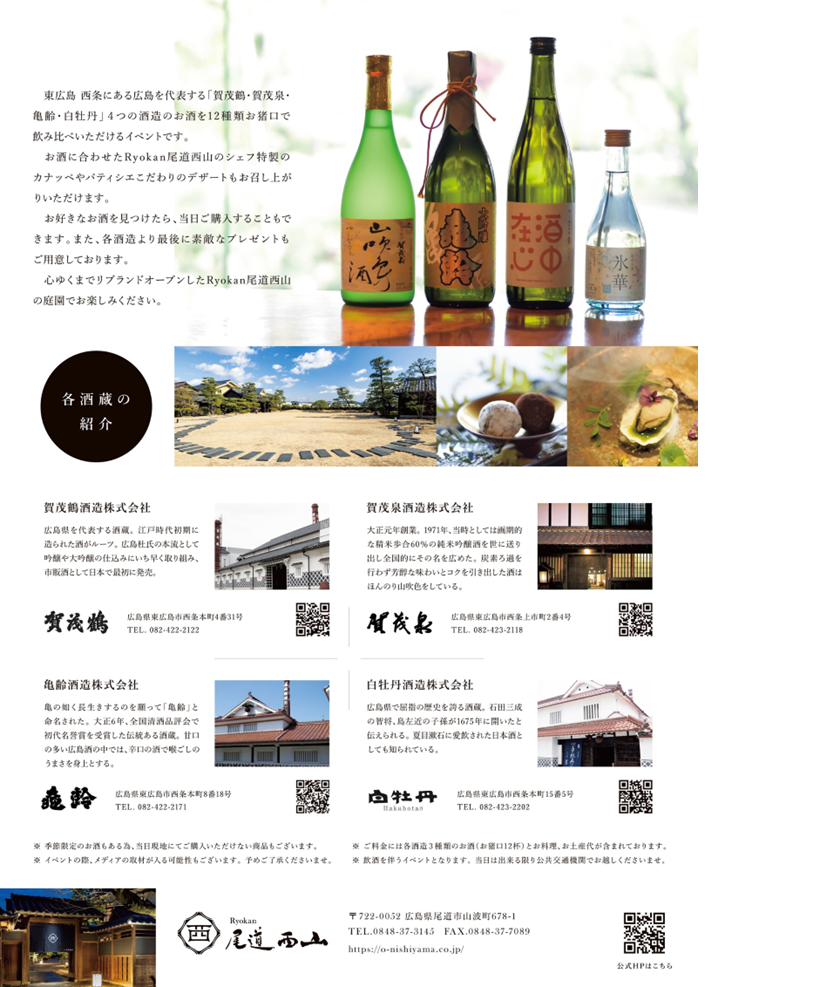 尾道の茶園文化を継承する「Ryokan尾道西山」の庭園にて、東広島 西条にある広島を代表する「賀茂鶴・賀茂泉・亀齢・白牡丹」4つの酒造のお酒を12種類お猪口で飲み比べいただけるイベントです。