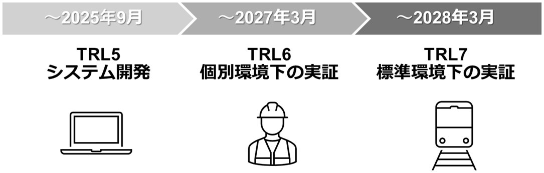TRL5通過の結果を通じてTRL6では、鉄道事業者の実需に適うシステムを開発し、TRL7において実地での運用を目指します。