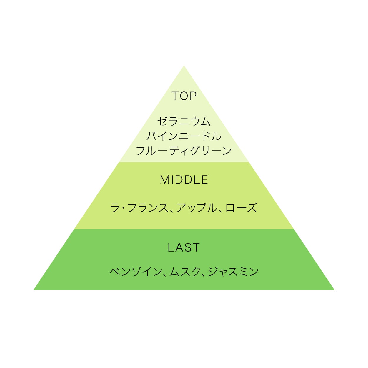 ラ・フランスを中心とした甘い果実感に、ローズやジャスミンの華やかなフローラル感を加えたフレッシュ&ジューシーなペアーの香り。軽やかなペアーの香りが、タオルドライ後もふんわりと続きます。