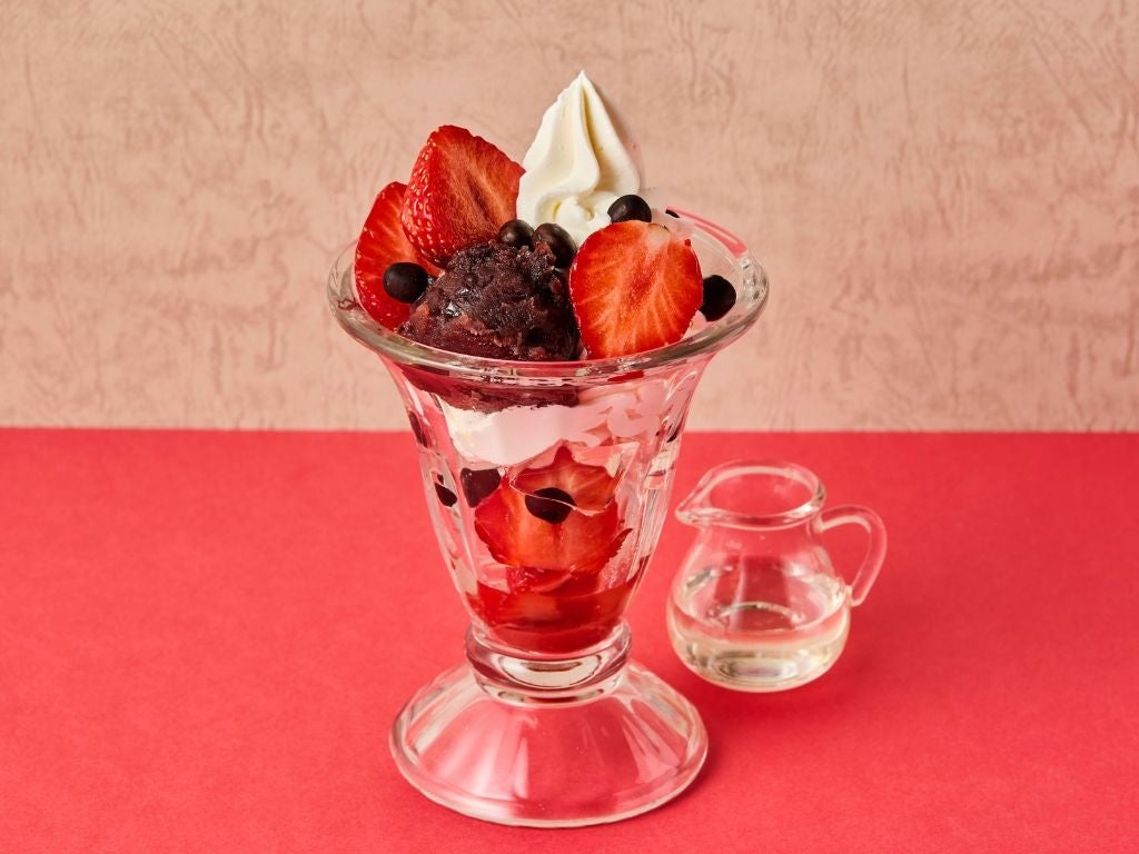 苺の甘酸っぱさが濃厚ソフトクリームと餡子・白蜜との組み合わせで、華やかに口の中で広がる期間限定のあんみつです。