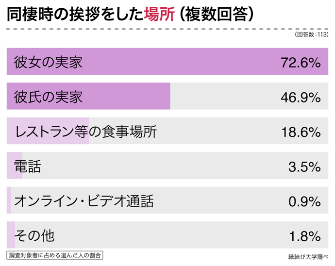 - 挨拶の場所は「彼女の実家」が72.6%と最多