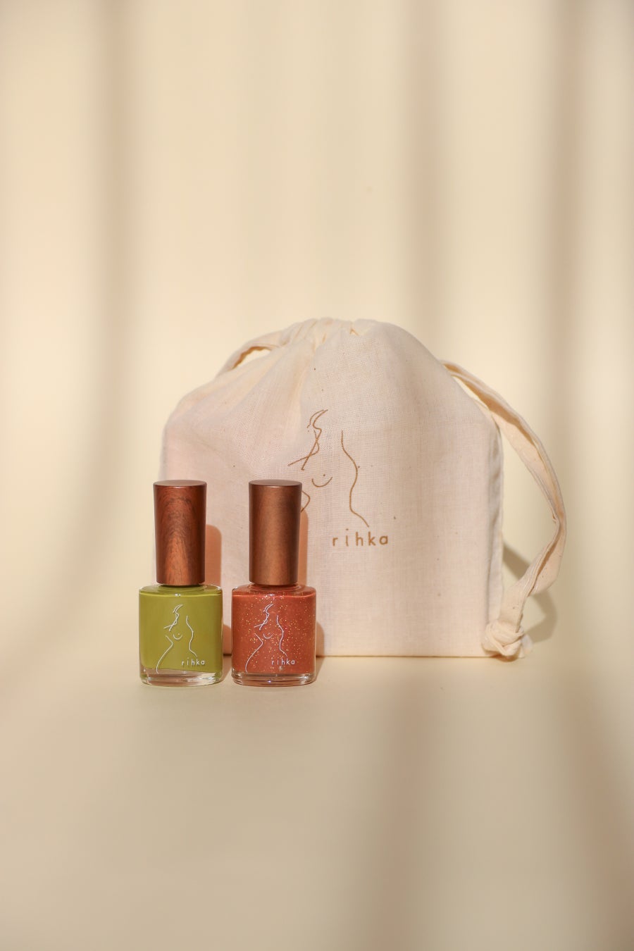 小粒のゴールドグリッター入りのくすみオレンジ「apple cider」とみずみずしくて明るい黄緑色を組み合わせた「mint tea」を組み合わせた、ホリデーシーズンにぴったりのネイルポリッシュ2点セットです。rihkaロゴをあしらったオリジナル巾着が付いてきます。