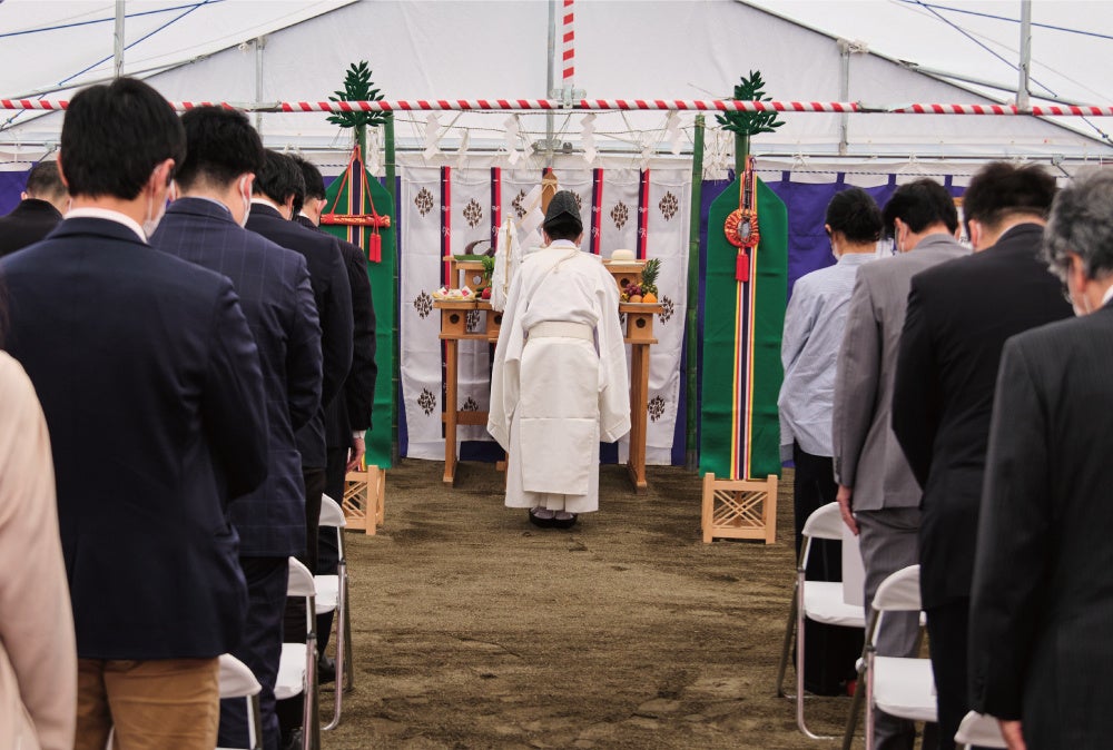 起工式では、砂川市長の善岡雅文様や砂川商工会議所の方々、みんなのすながわプロジェクト実行委員メンバーや建築家アリイリエアーキテクツ、建設を担当する石塚建設興業株式会社の方々など約30名が参列しました。地鎮の儀では、砂川市長と株式会社シロ代表取締役会長兼プロジェクト実行委員長今井の共同で鍬入れが行われ、5月から着工をする工事の無事や安全と、施設の繁栄が祈願されました。
