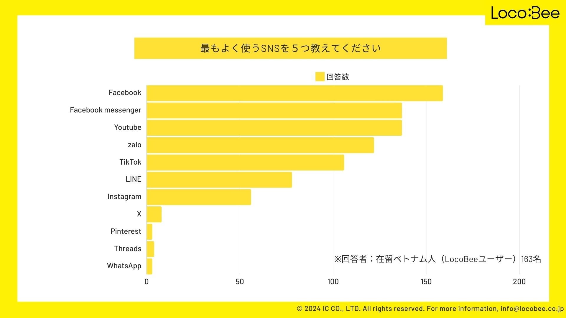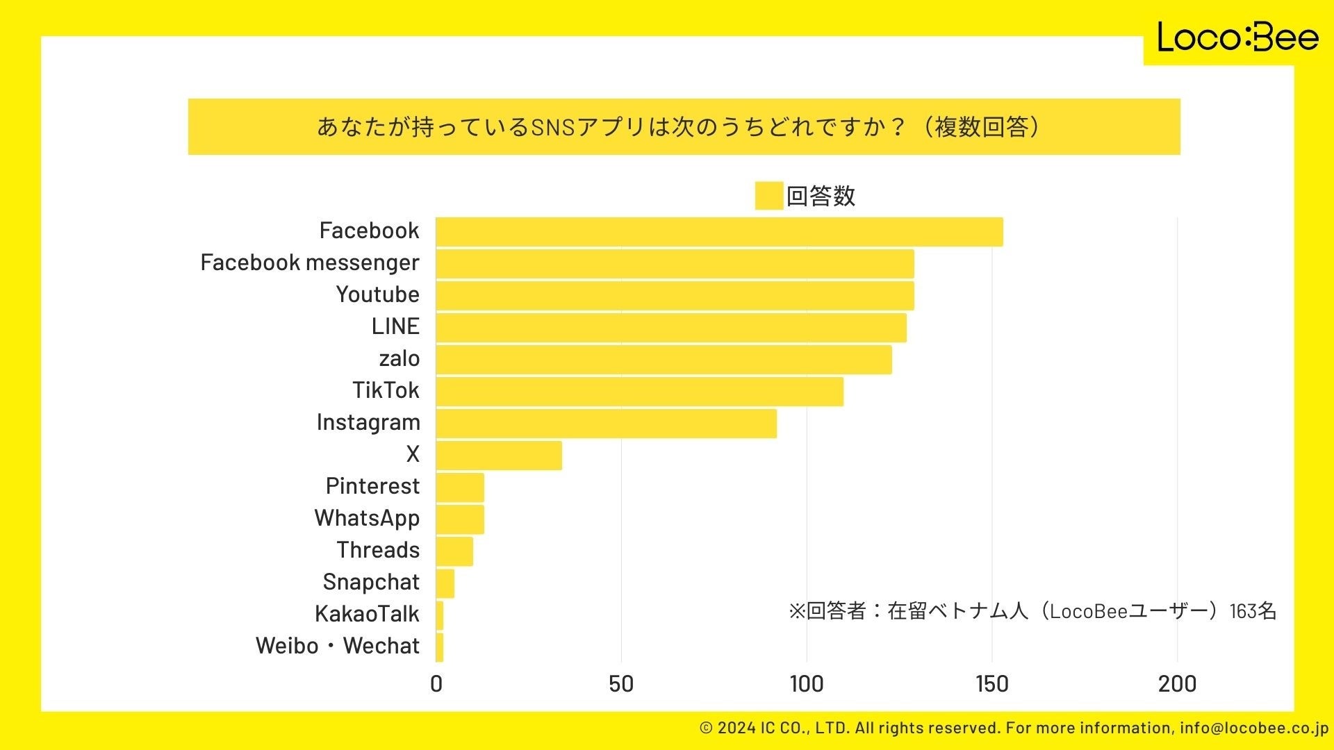 ベトナム人に届けるにはSNSが有効と言われていますが、実際のベトナム人のSNS利用状況はどのようになっているのでしょうか。在留ベトナム人の好きなSNSや、SNSの利用頻度、SNSを利用する目的など、マーケティングにおいて知っておくべきSNSの利用状況を調査するため、今回LocoBeeでは在留ベトナム人に対し、アンケート調査を行いました。