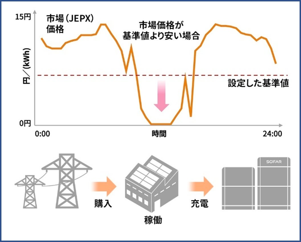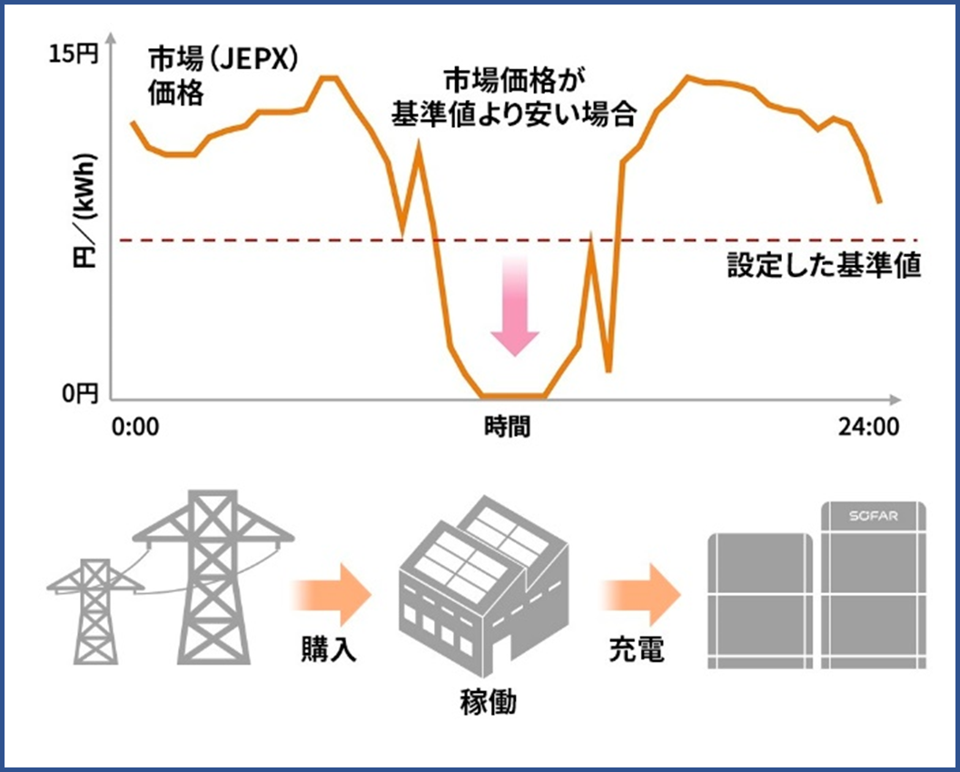 市場価格が設定した基準値より安い場合:安い電力を購入して事業所で使用。また蓄電池に充電。