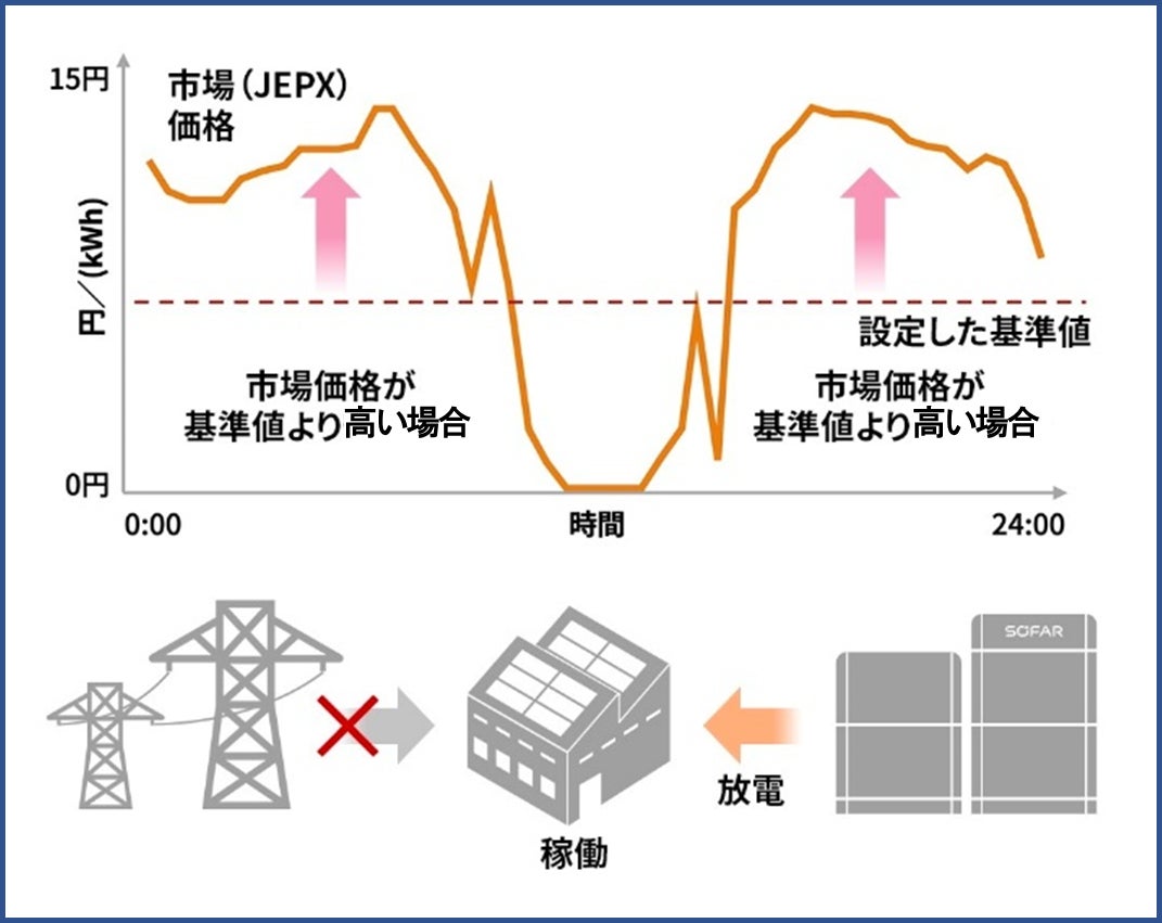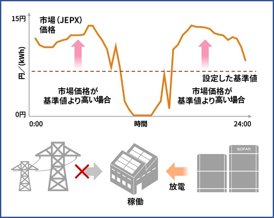 市場価格が設定した基準値より高い場合:充電してあった電気を放電して事業所で使用。