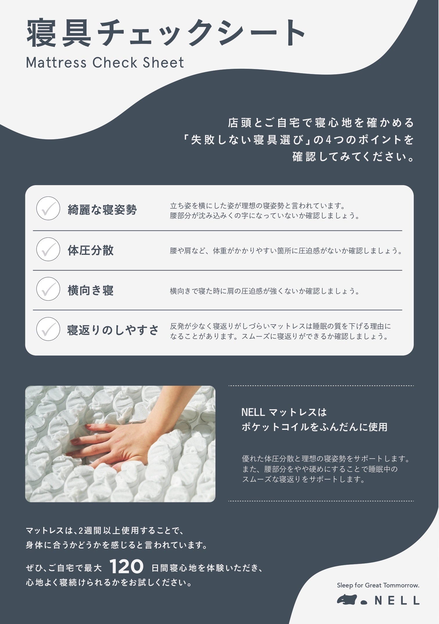 また、「マットレスの買い替え時や、合っているかが分からない」というお声に応えて、「失敗しないマットレスの選び方シート」を公開。会場では本シートをもとに、NELLスタッフがお客様一人ひとりにぴったりのマットレスをご案内いたします。