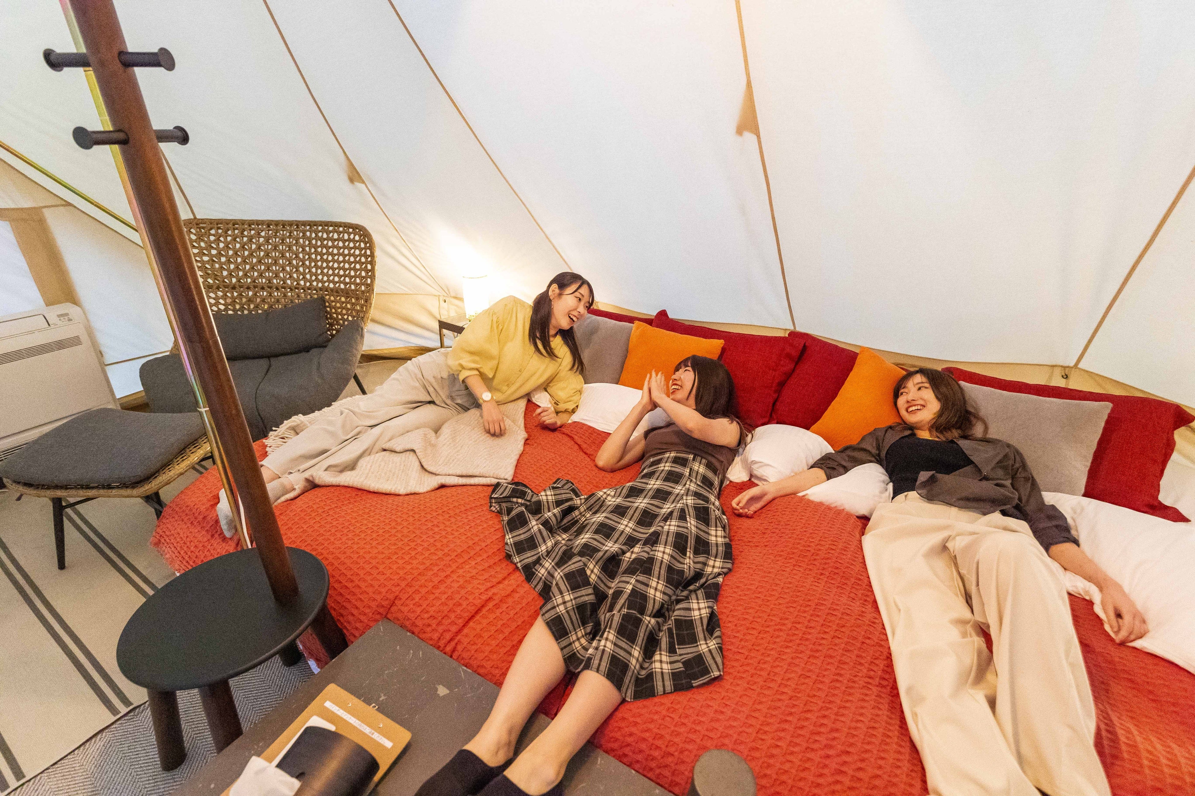 解放感抜群の「皇帝テント」、景色が一望できるロフト付きの「ログハウス」、和テイストで落ち着いた「和室」の3タイプからお好きな客室をお選びいただけます。