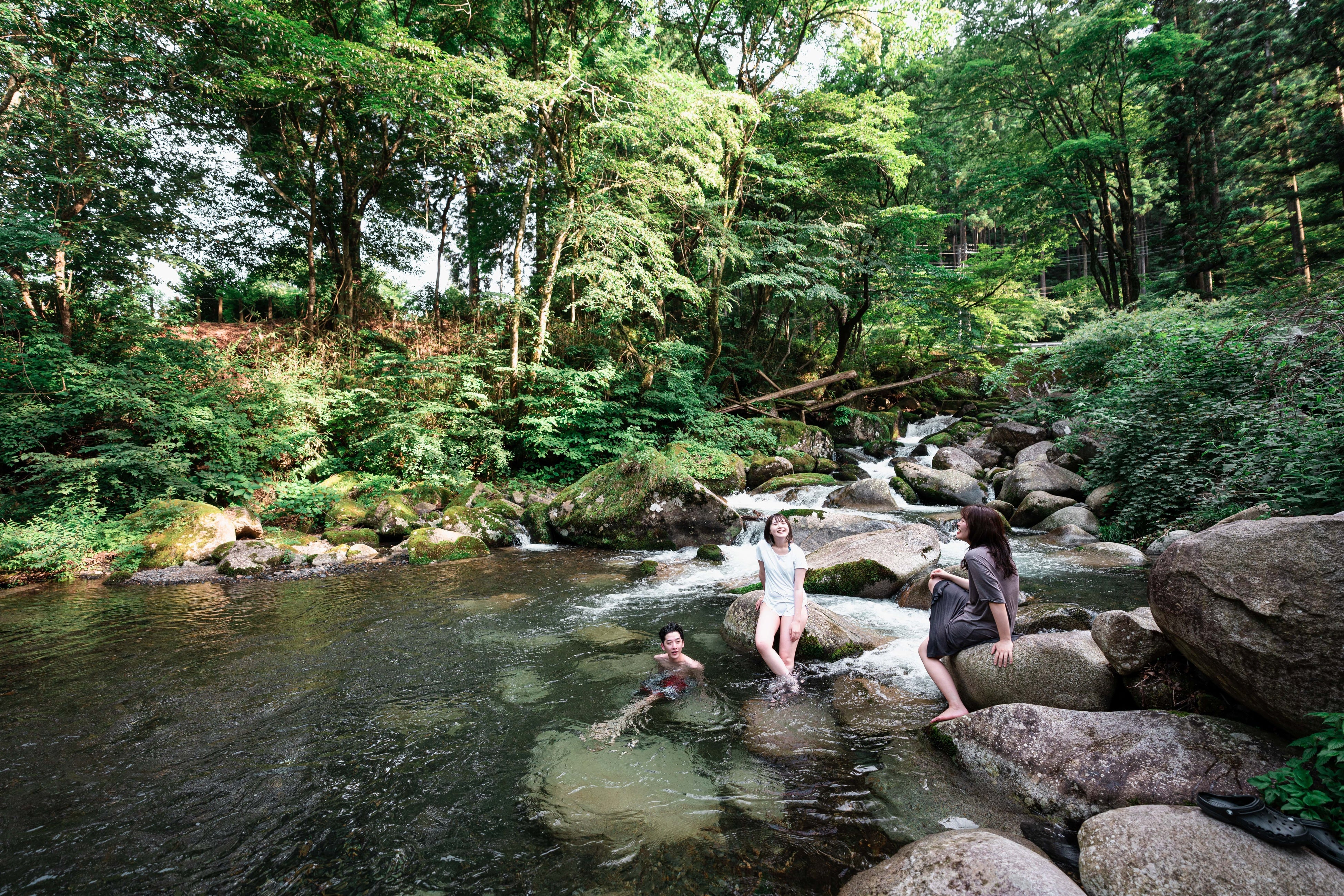 ザランタン鹿沼|前日光あわの山荘、最大の魅力は渓流沿いの「テントサウナ」。水風呂の代わりに渓流に飛び込み、自然を全身で感じながらのととのいを体験できます。