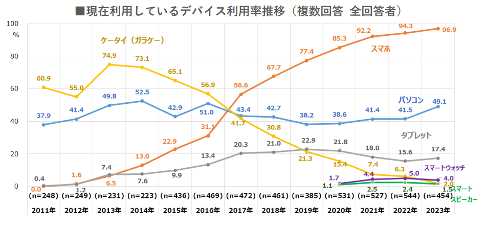 【デジタルデバイスに関する意識と実態調査2023】シニア女性のスマホ利用率は96.9%。EC、オンライン決済、SNSの利用率上昇が続く。