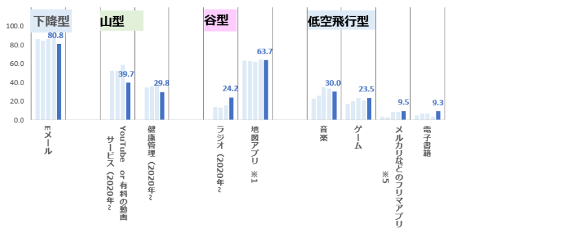 コロナ前~コロナ禍~コロナ後の視点で経年トレンドを追うと、上昇、横ばい、下降がはっきり見えました。その傾向を”上昇成長型”、”上昇成熟型”、”下降型”、”山型”、”谷型”と名付けました。”上昇成長型”は「オンライン決済」「LINE電話」「動画の撮影」「ポイ活」「SNS」「ネットショッピング」「Instagram」「Zoomなどのオンライン通話」など、”上昇成熟型”は「調べ物・Web検索」「LINEトーク(メッセージ)」「電話の受発信」「写真静止画の撮影」。「SNS」「Instagram」「LINEトーク」は”下降型”となった「Eメール」からとって代わったと言えそうです。”山型”の「YouTubeなど有料の動画サービス」「健康管理」はコロナバブルがあった、「ラジオ」「地図アプリ」は外出先で活用されていると推察できます。