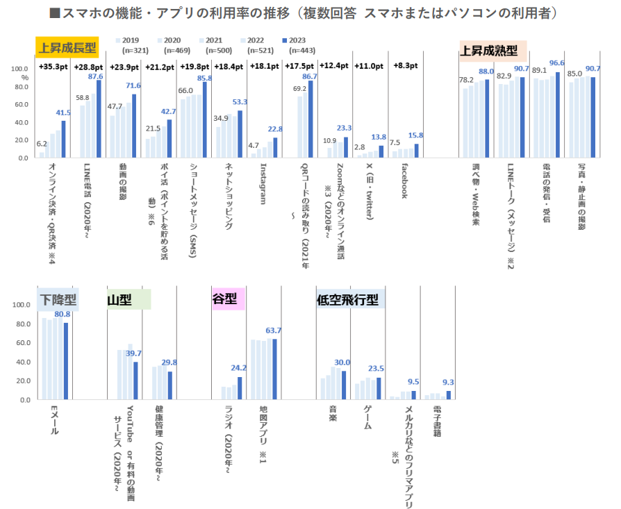 ・2019年(コロナ前)と2023年(コロナ後)の、スマホの機能・アプリの利用率を算出。(分母は「スマホまたはパソコン」の利用者)二地点での利用率の差を、“上昇成長型”、“上昇成熟型”、“下降型”、“山形”、“谷型”、“低空飛行型”に分けてみた。“上昇成長型”の中で、20.0ポイント以上の利用率アップとなったのは、オンライン決済・QR決済41.5%(+35.3ポイント)、LINE電話87.6%(2020年~ +28.8ポイント)、動画の撮影71.6%(+23.9ポイント)、ポイ活42.7%(+21.2ポイント)であった。