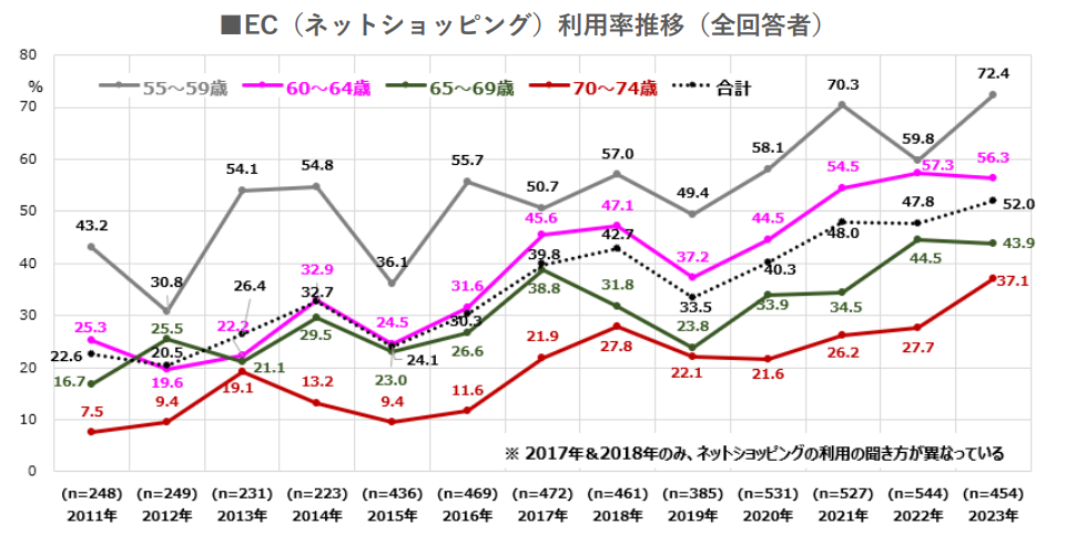 シニア女性のEC(ネットショッピング)利用率は、過去最大の52.0%。