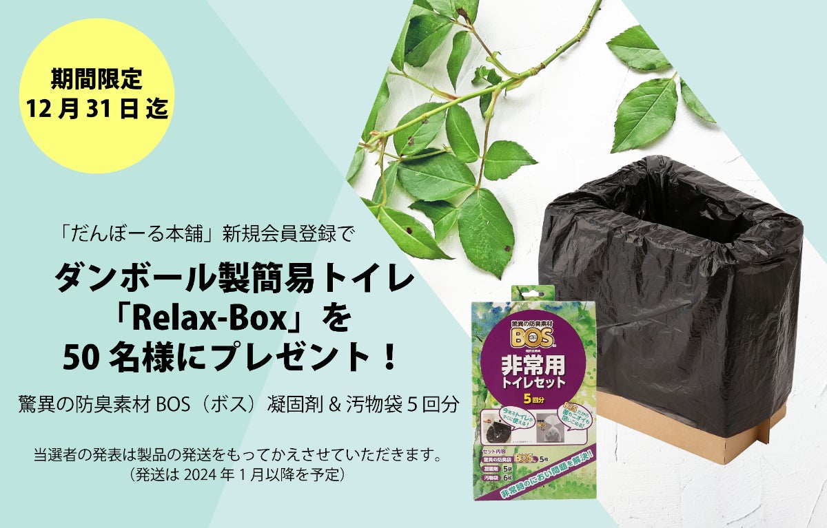 抽選で50名様にダンボール製簡易トイレ「Relax-Box」(5回分)をプレゼントする