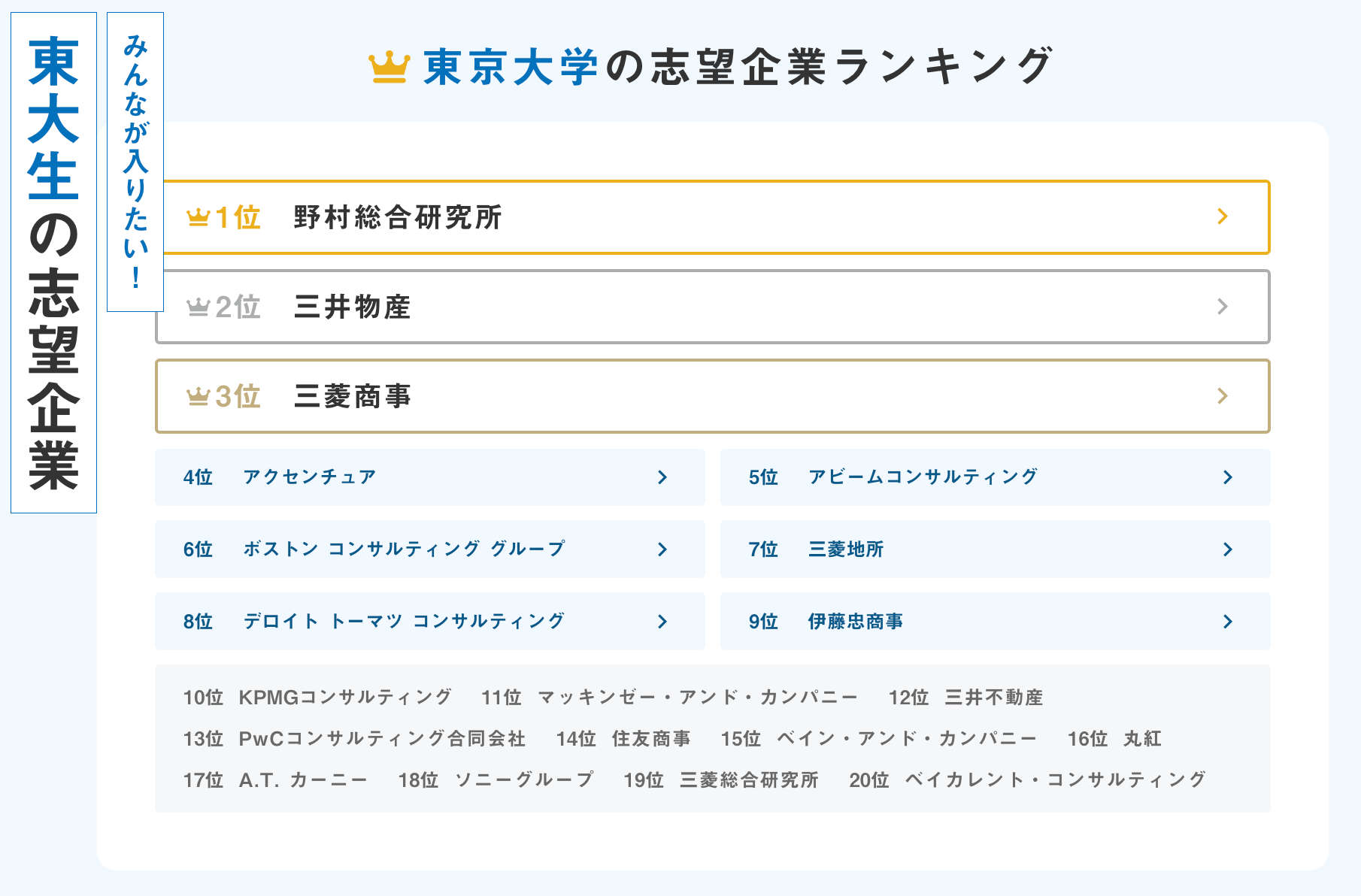 先輩たちが興味を持っていた業界と企業を、志望理由と併せて公開。自分の大学の人気業界や人気企業を紹介し、どんな業界・企業を受けてみようかと考える際の指針を提供します。