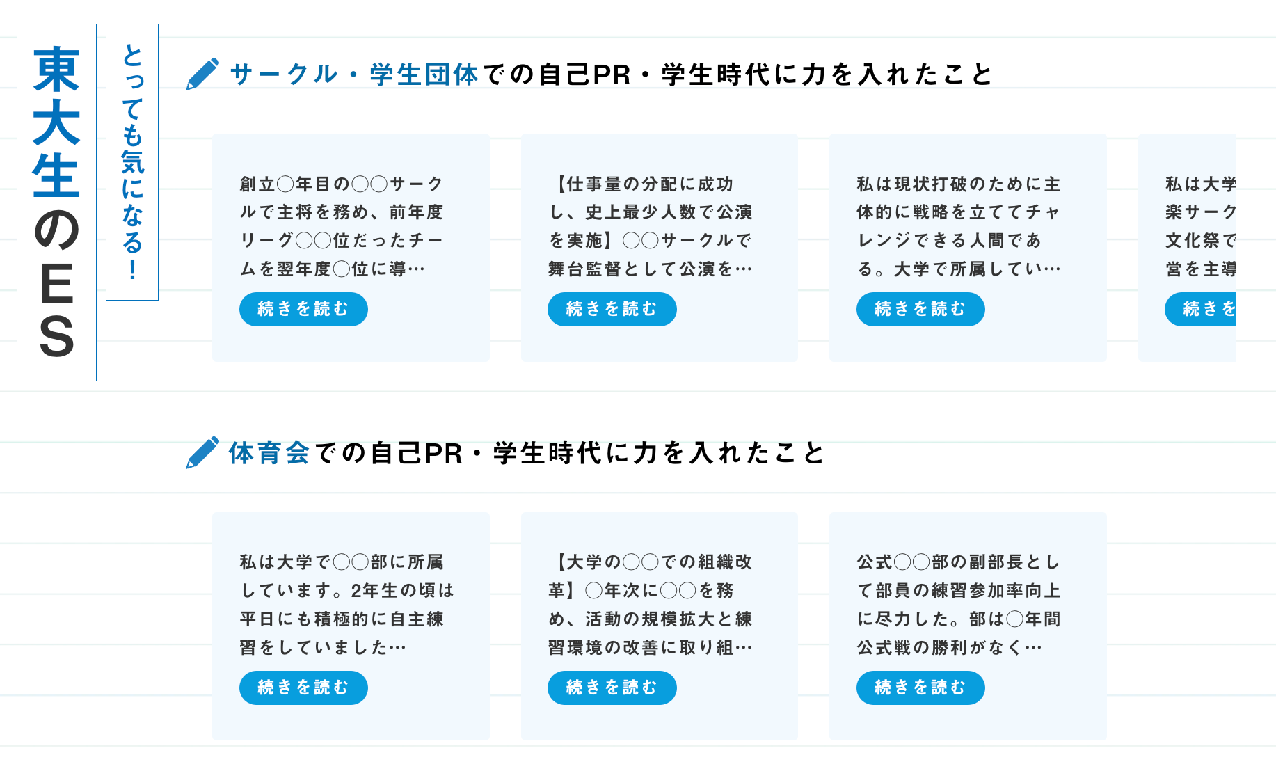 選考に参加する上で必須のエントリーシートを、「サークル」「研究」「バイト」などのエピソード別に公開。自分と似たエピソードを持つ大学の先輩が、内容をどのようにまとめてアピールしていたかを参考にすることができます。