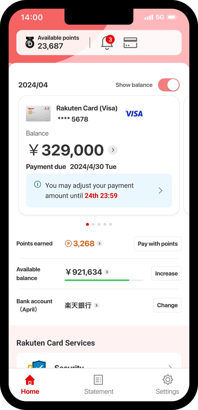 本アプリでは、会員様専用オンラインサービス「楽天e-NAVI」の初回登録ができるほか、請求金額・利用明細・利用可能枠・口座設定などの確認ができ、不明な点については楽天カードホームページにある英語版FAQに遷移して確認することができます。