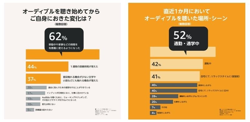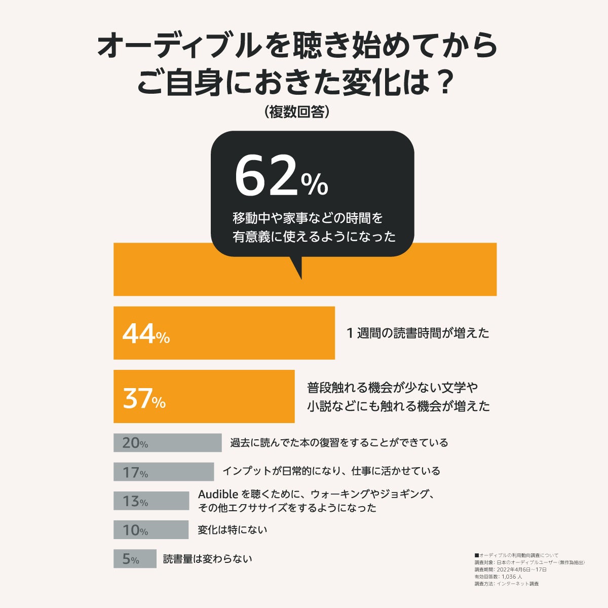 ・オーディブル利用者にサービス利用後の変化について聞いたところ、62%の人が「移動中や家事などの時間を有意義に使えるようになった」と回答し、37%が「普段触れる機会が少ない文学や小説などにも触れる機会が増えた」と回答しています。