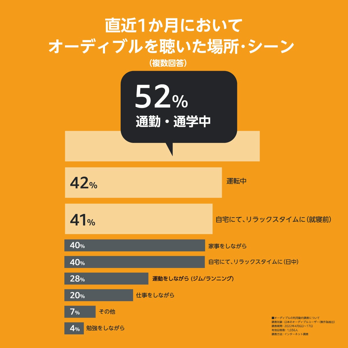 ・直近1ヶ月において、Audibleを聴いた場所・シーンについては「通勤・通学中」が最多で52%となった他、「運転中」が42%、「自宅にて、リラックスタイムに(就寝前)」が41%、「家事をしながら」と「自宅にて、リラックスタイムに(日中)」がそれぞれ40%という結果となりました。