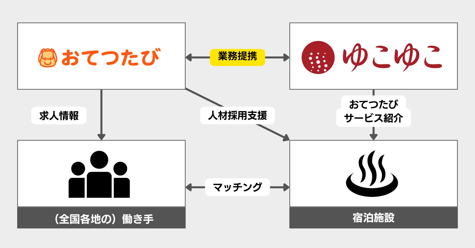 本提携により、「おてつたび」の6万人を超えるユーザーに対し、「ゆこゆこ」が提携している宿泊施設を紹介し、人材マッチングを行います。これにより、宿泊施設における人手不足の解消を支援し、地域経済の活性化に貢献してまいります。