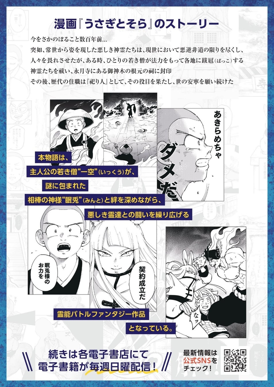 漫画『うさぎとそら』は2023年3月19日(日)より連載が開始した霊能バトルファンタジー漫画で、最新話となる第8話を2023年5月7日(日)より「コミックシーモア、Amebaマンガ、DMMブックス、FOD、Renta!、紀伊國屋書店Kinoppy ※ほか順次配信予定」などの人気電子書店にて、電子書籍の配信を開始致します。