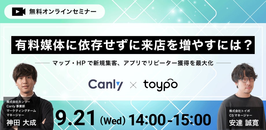 『有料媒体に依存せずに来店を増やすには?〜マップ・HPで新規集客、アプリでリピーター獲得を最大化〜』トイポ×カンリーの共催ウェビナーを9月21日に開催決定!