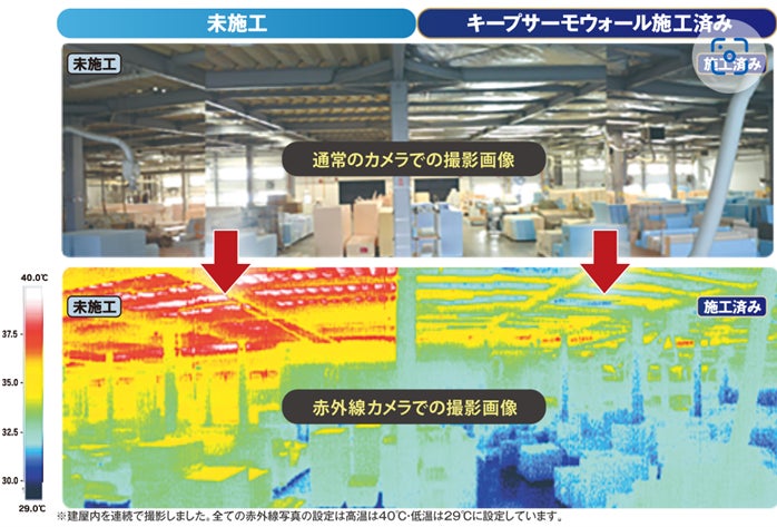 ㈱ 三栄コーポレーション(東京都台東区、代表取締役社長 水越 雅己、東証スタンダード上場 証券コード8119)の100%子会社で、各種設備・什器、玩具、物流資材等を輸入販売する㈱サムコ(東京都台東区、代表取締役社長 柴田 渉) は、建物の屋根や壁に設置することで輻射熱を反射し建物内の温度上昇を防ぐ高性能遮熱シート「キープサーモウォール」の輸入販売を行っております。同社は、販売先である㈱サンユー印刷と当遮熱シートの普及・拡販に協働で営業体制を組んでおり、この度、環境省の「環境技術実証事業(ETV事業)」において、建物内の温度上昇を防ぎ、冷房負荷を軽減し消費電力を削減する、という当遮熱シートを使った施工効果が実証されました。