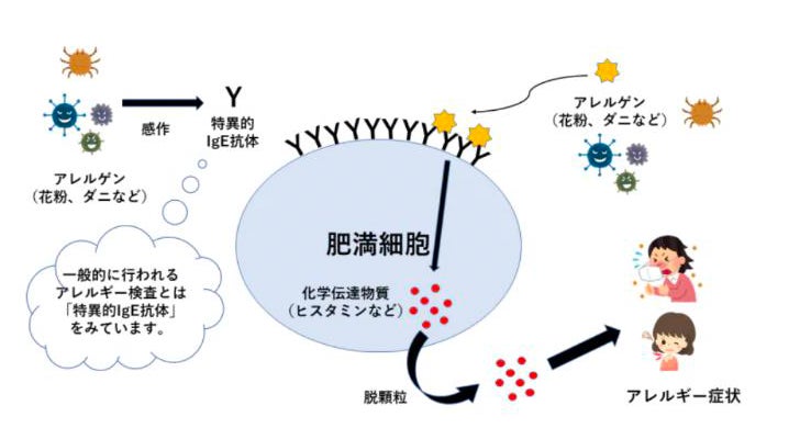 2月~4月はスギ花粉、9月~10月はダニのアレルゲンを吸い込むことが原因と考えられます。「アレルゲン(抗原)」とはアレルギーの原因となる物質で、私たちの身のまわりには、食物、花粉、ダニなど多くのアレルゲンが存在し、ダニそのものだけではなく、ダニのフンやバラバラになった破片を含みます。