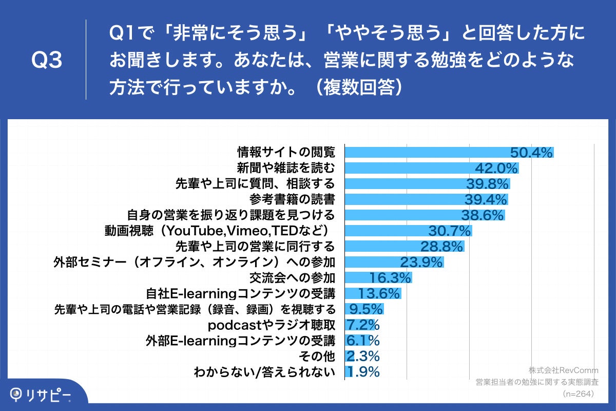 MVP/社内受賞歴のある営業担当者の91.4%が、営業で高い成果を出すためには「営業に関する勉強」を重要視していることが分かりました。実際に実施した勉強方法は「情報サイトの閲覧」が50.4%で最多、勉強内容は「自社の商品に関する専門知識の向上」が54.9%で最多の結果でしたが、実際に営業成果に繋がった方法は、「先輩や上司に質問、相談」や「自身の課題を見つける」「情報サイトの閲覧」という意見が多数挙がりました。