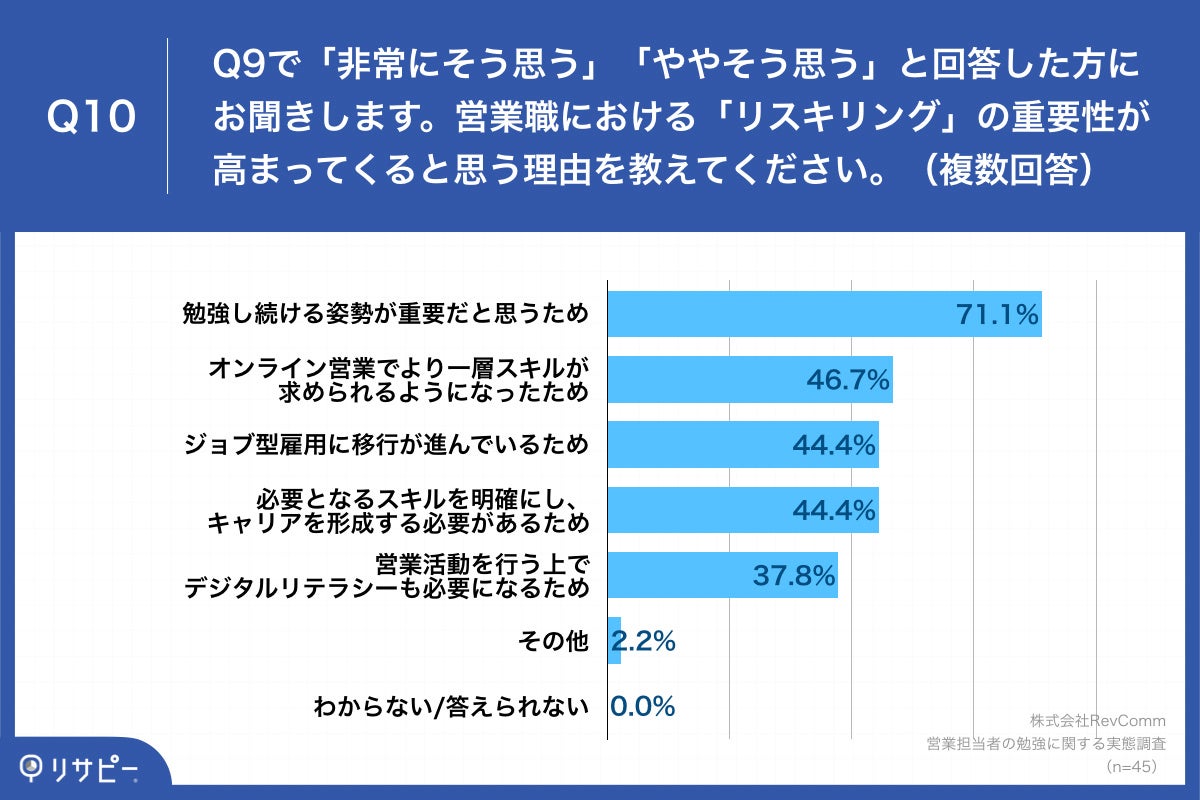 また、成果を出し続ける営業担当者の中では、今後の営業職において93.7%が「リスキリングの重要性」の高まりを実感していることが分かりました。その理由として、71.1%が「勉強し続ける姿勢が重要だと思う」と回答しており、このマインドが成果を出し続けているポイントであることが伺えました。
