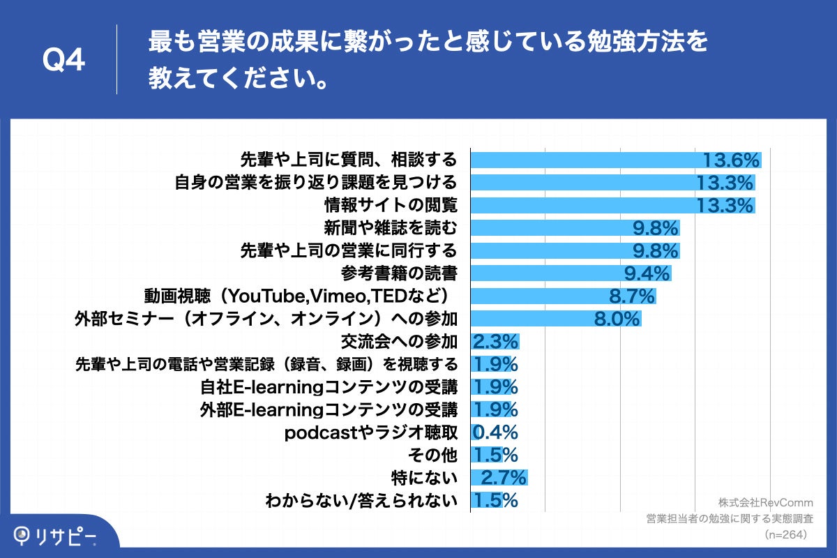 - 実際に営業成果に繋がった方法は、「先輩や上司に質問、相談」や「情報サイトの閲覧」「自身の課題を見つける」が多数