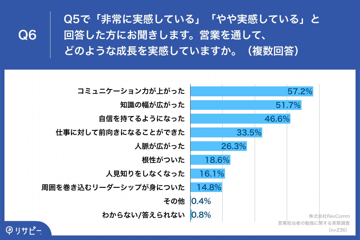 - 営業を通して、半数以上が「コミュニケーション力向上」や「知識の幅が広がった」を実感