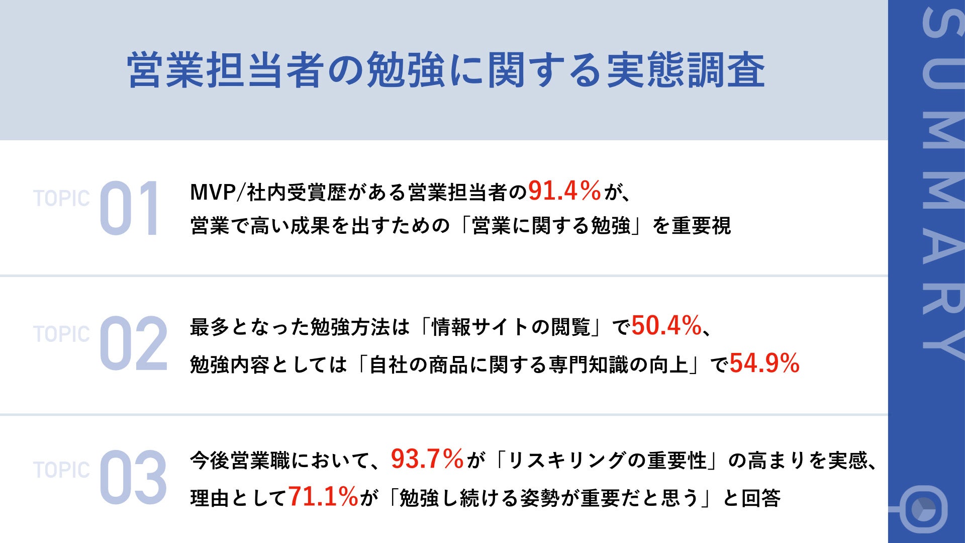- MVP/社内受賞歴がある営業担当者の91.4%が、営業で高い成果を出すための「営業に関する勉強」を重要視